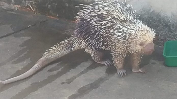 Um porco-espinho com queimaduras pelo corpo apareceu na Arse 142, conhecida como quadra 1.406 Sul, em Palmas, no início da tarde desta segunda-feira (7). Moradores acionaram policiais militares, que tiveram que tocar o animal para o mato.