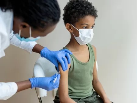 Doses serão aplicadas nesta sexta (28) e sábado (29) no centro de Convenções Vicente de Paula. Grupo será vacinado com doses da Pfizer e CoronaVac, conforme a idade. Menino sendo vacinado contra Covid em Porto Nacional