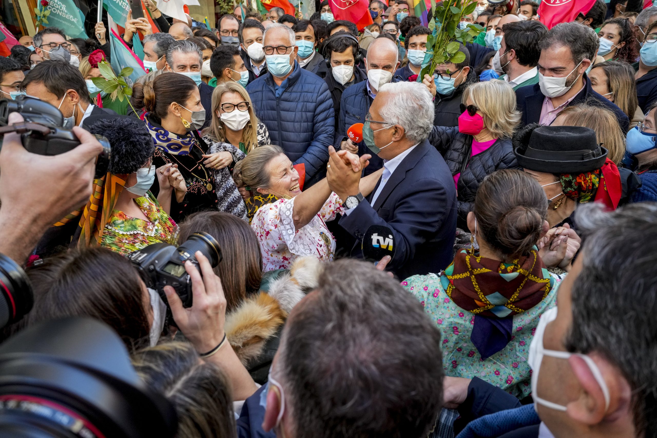 Maioria absoluta dá aval aos socialistas, liderados pelo premiê António Costa, de aprovarem qualquer projeto no Parlamento — mas sem perder de vista a ascensão meteórica da extrema direita na Casa. O primeiro-ministro de Portugal (e secretário-geral do Partido Socialista), António Costa, dança com uma apoiadora durante campanha no centro da capital Lisboa em 28 de janeiro de 2022
