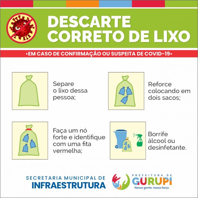 A Secretaria de Infraestrutura, por meio do Departamento de Limpeza Urbana da Prefeitura de Gurupi, dá orientações de como cuidar do lixo doméstico nesse período de pandemia, para pessoas infectadas ou não com a Covid-19, e solicita a colaboração de todos nessa missão importantíssima, que é manter a cidade limpa.