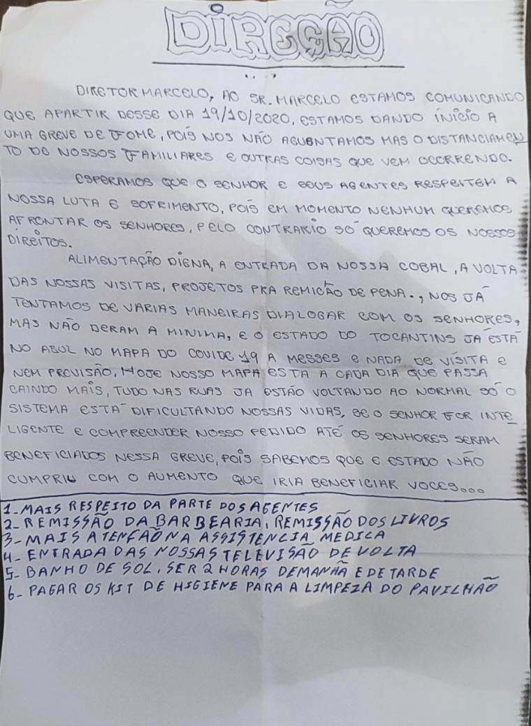Em carta enviada ao diretor da unidade, os presos do Pavilhão 01 reivindicam retorno das TVs para as celas; banho de sol com duração de 2 horas de manhã e tarde, além de outras cobranças.