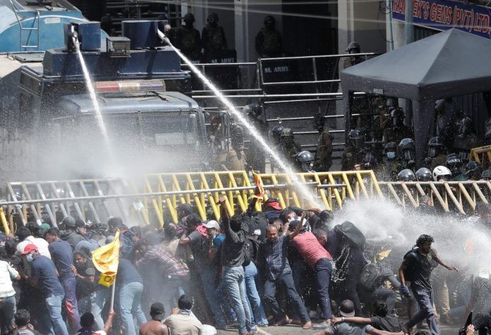 Policiais tentam conter manifestantes com jatos de água no Sri Lanka, em 9 de julho de 2022