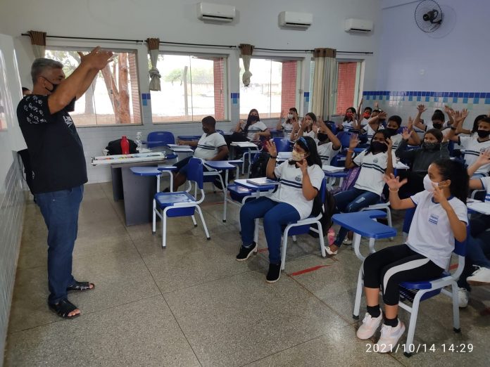 Francisco da Paz de Carvalho estimula a comunicação entre estudantes ouvintes e surdos ao ensiná-los usando a Língua Brasileira de Sinais (Libras). Professor ensina libras para alunos da rede municipal