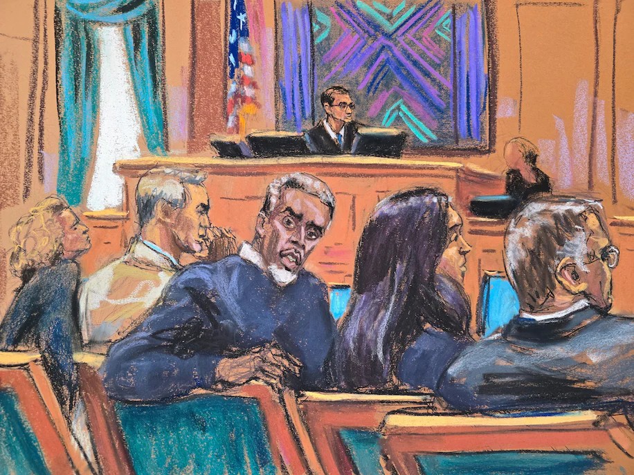 Ilustração mostra Sean ‘Diddy’ Combs em tribunal durante julgamento