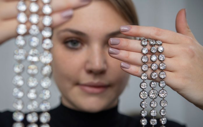 As joias, com 112 diamantes, foram vendidas após cinco minutos de leilão por 7,5 milhões de francos suíços (US$ 8,1 milhões), um preço que quase duplicou a estimativa inicial.