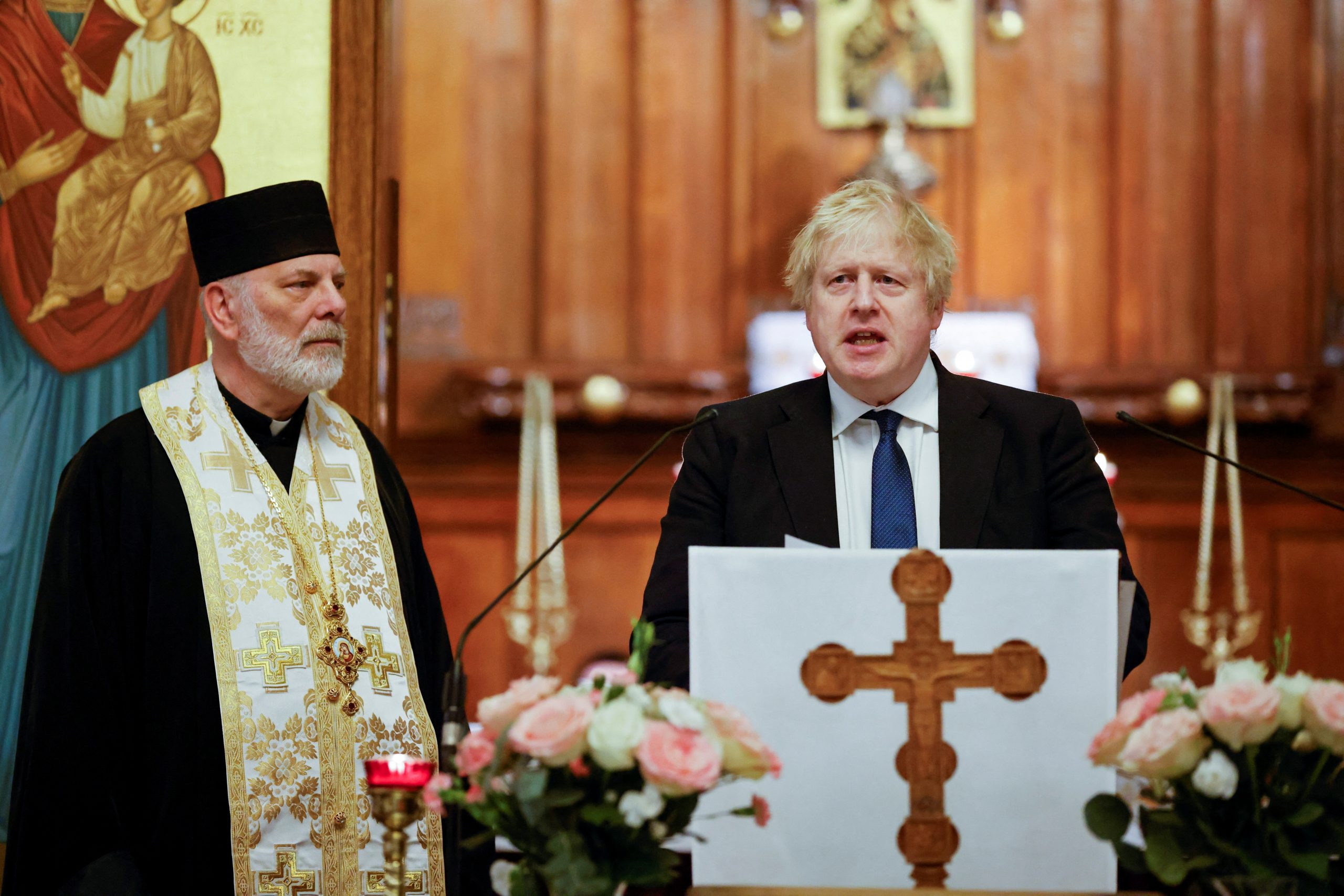 O primeiro-ministro britânico, Boris Johnson, em encontro com a comunidade ucraniana em Londres no domingo (27)