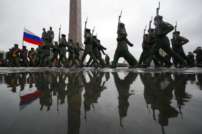 Kremlin anunciou que vai reforçar o exército nacional com 350 mil homens. Mas de onde virão os novos soldados e, em vista das sanções internacionais, como Moscou pretende financiar a ampliação? Soldados do exército russo participam de um evento marcando o 80º aniversário da quebra do cerco nazista de Leningrado, (agora São Petersburgo) durante a Segunda Guerra Mundial, no monumento dos Heróis Defensores de Leningrado, em São Petersburgo, Rússia, quarta-feira, janeiro 18 de 2023.
