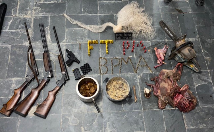 Os suspeitos ainda estavam com a carne de animais silvestres abatidos. Foi possível identificar um veado, uma ave jaó e uma cotia. Um motosserra sem licença também foi apreendida.