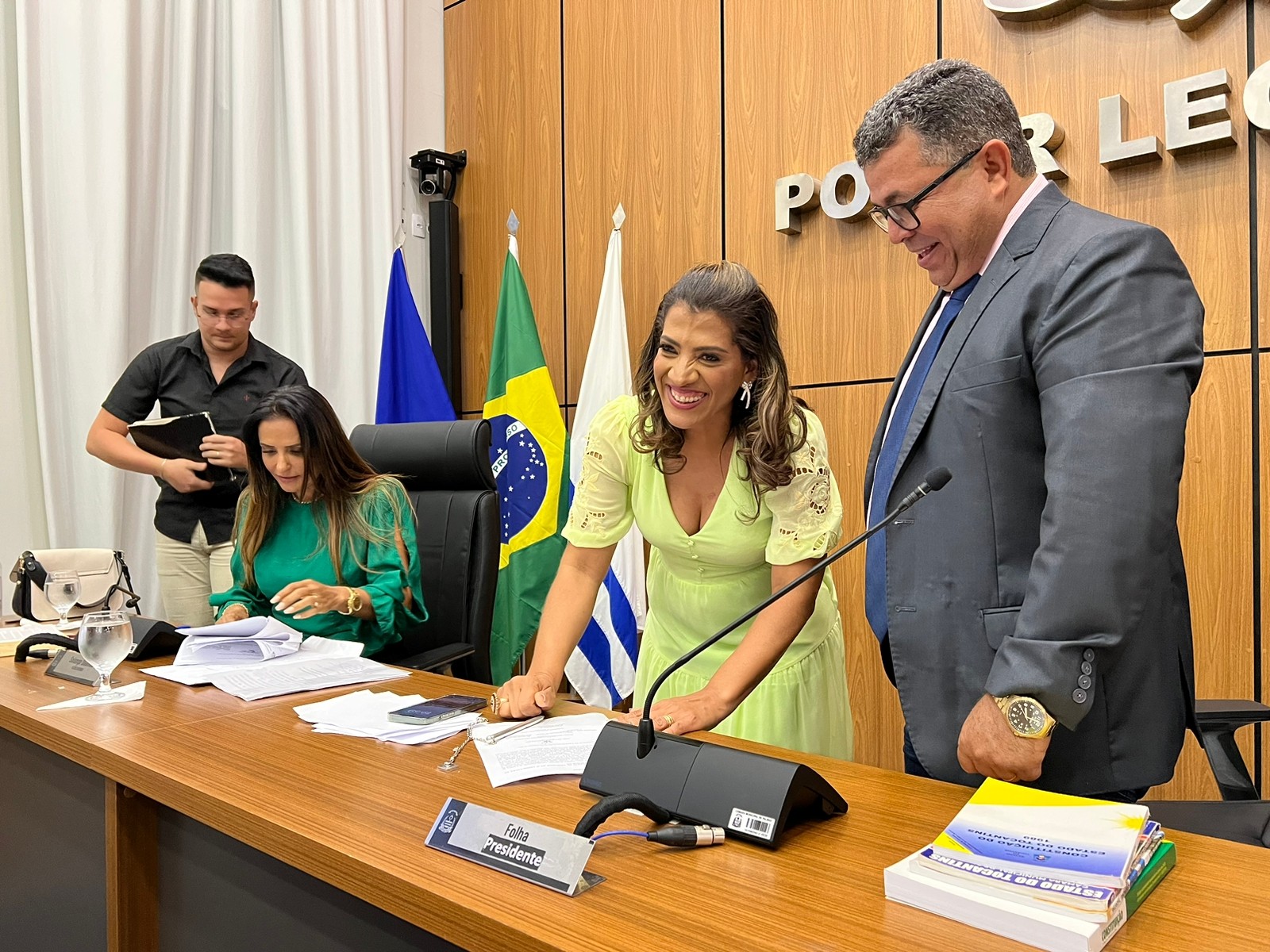 A licença é para tratamento de saúde. Posse da suplente foi realizada na noite desta quinta-feira (5). Elaine Rocha (Solidariedade) ao lado do presidente da Câmara, vereador Folha (PSDB), durante cerimônia de posse