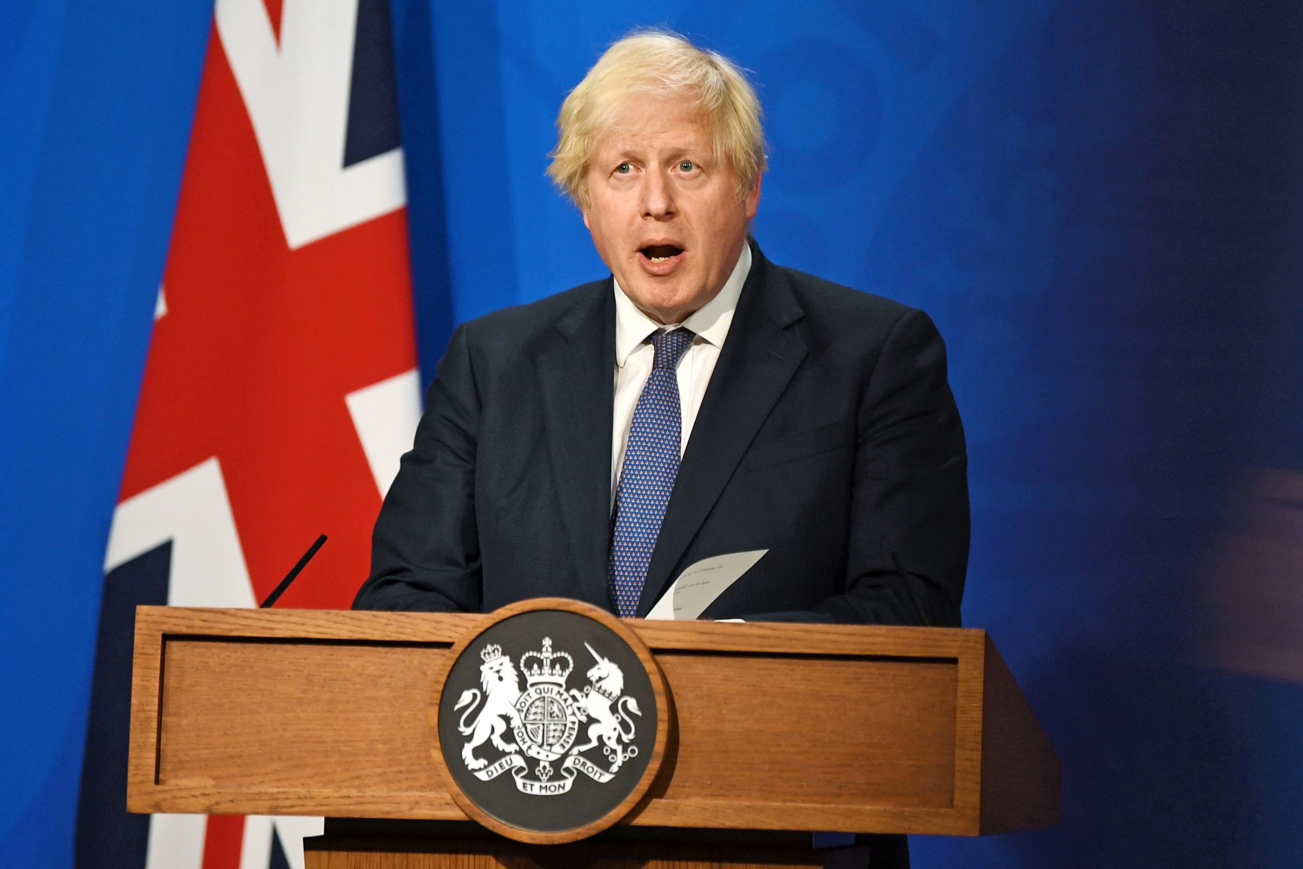 Será necessário comprovar o esquema completo de vacinação. Testes RT-PCR deixarão de ser exigidos a turistas. O primeiro-ministro britânico, Boris Johnson, em entrevista coletiva em Londres em 12 de julho de 2021
