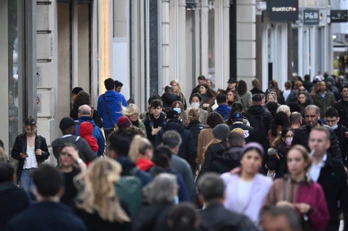 Pessoas sem máscaras de proteção contra a Covid-19 caminham pela Oxford Street, em Londres, em plena pandemia da Covid-19 no Reino Unido, em 20 de outubro de 2021