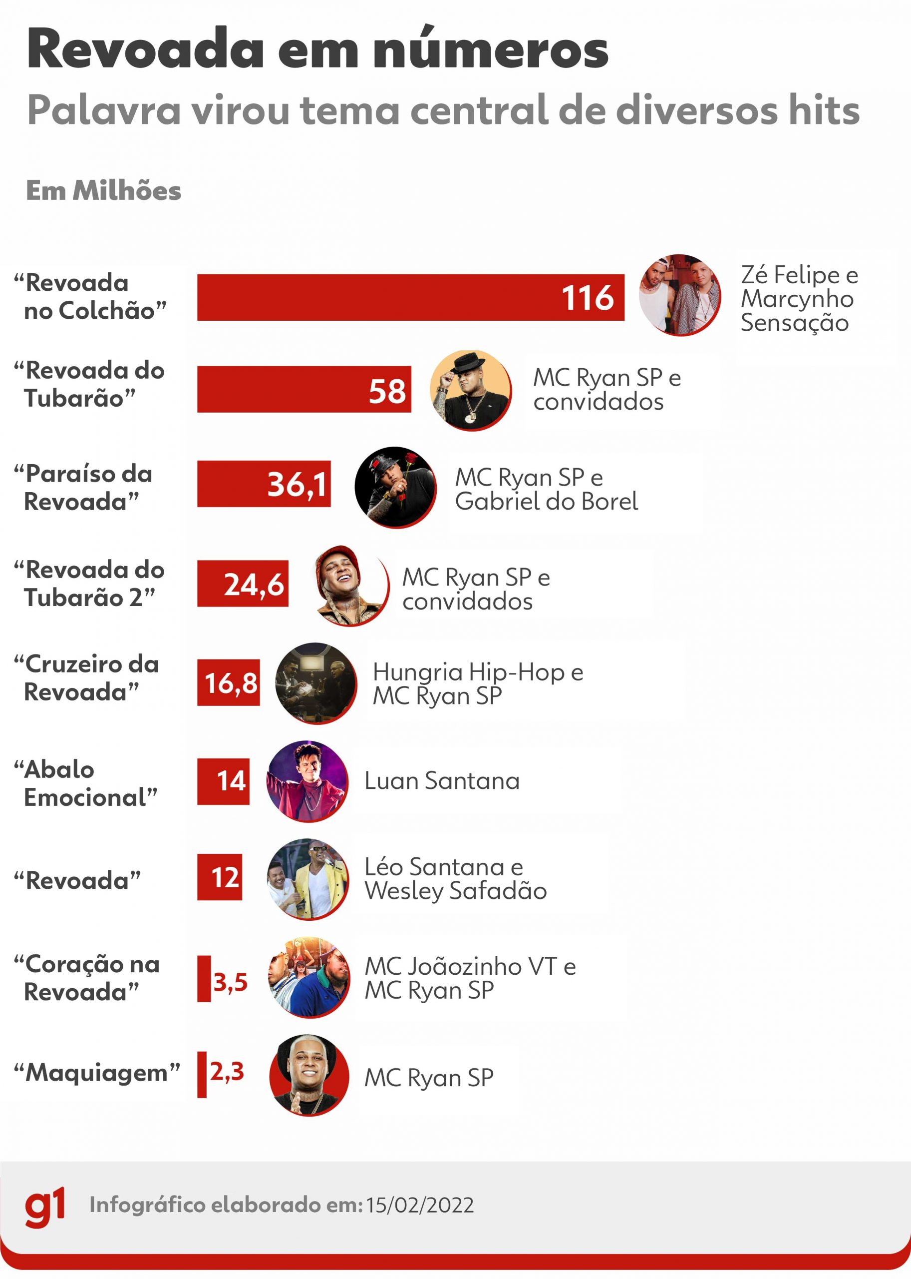 Revoada aparece em hits de MC Ryan SP, Zé Felipe, Leo Santana e Luan Santana; números de views no YouTube são do dia 15 de fevereiro
