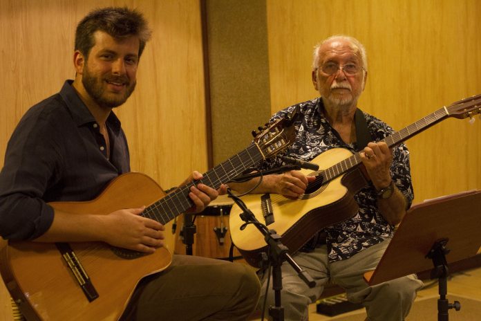 Artistas gravam no Rio duas músicas, ‘O barquinho’ e a inédita ‘Dentro do abraço’, em duetos. ♪ Aos 84 anos, em plena atividade, Roberto Menescal está em estúdio nesta segunda-feira, 18 de abril, com Tiago Nacarato, cantor e compositor português de 31 anos que vem fazendo músicas e conexões com artistas brasileiros desde que chamou a atenção há cinco anos como integrante do programa The Voice em Portugal na edição de 2017.