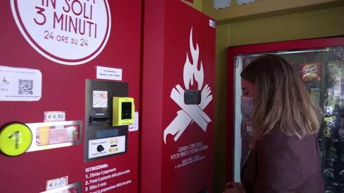 Mulher compra pizza em máquina automática em Roma