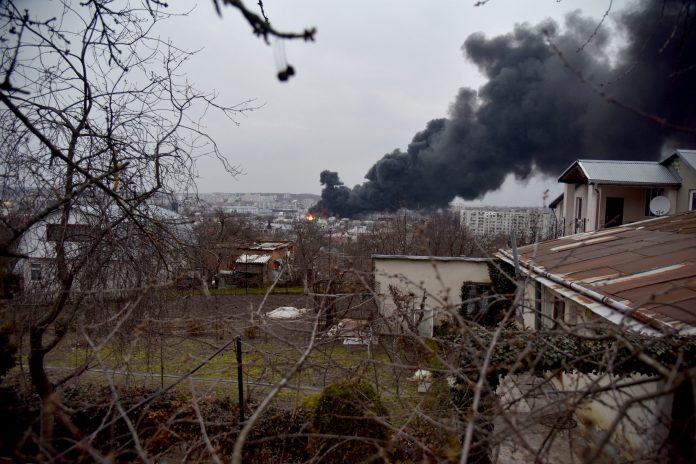 Fumaça é vista após ataque aéreo russo contra a cidade de Lviv, na Ucrânia