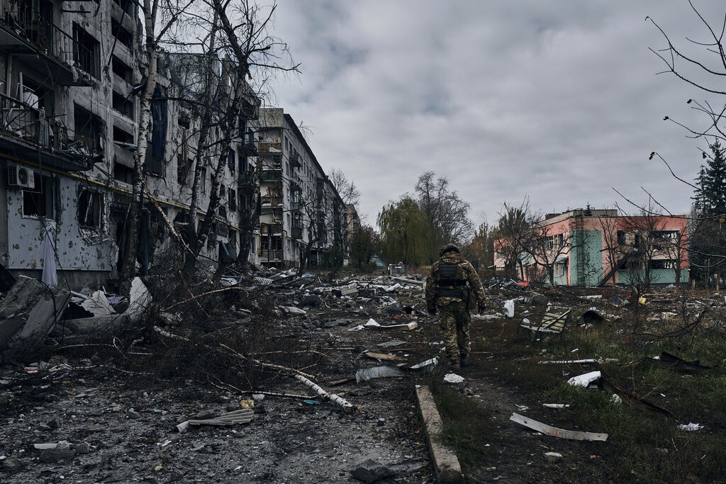 As linhas de frente no leste da Ucrânia estavam praticamente congeladas desde novembro, mas o ímpeto voltou recentemente para a Rússia, que obteve ganhos incrementais pela primeira vez desde meados de 2022. Um soldado ucraniano passa por casas destruídas pelo bombardeio russo em Bakhmut, região de Donetsk, Ucrânia, quinta-feira, 10 de novembro de 2022.