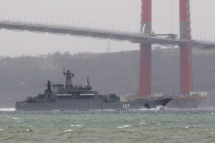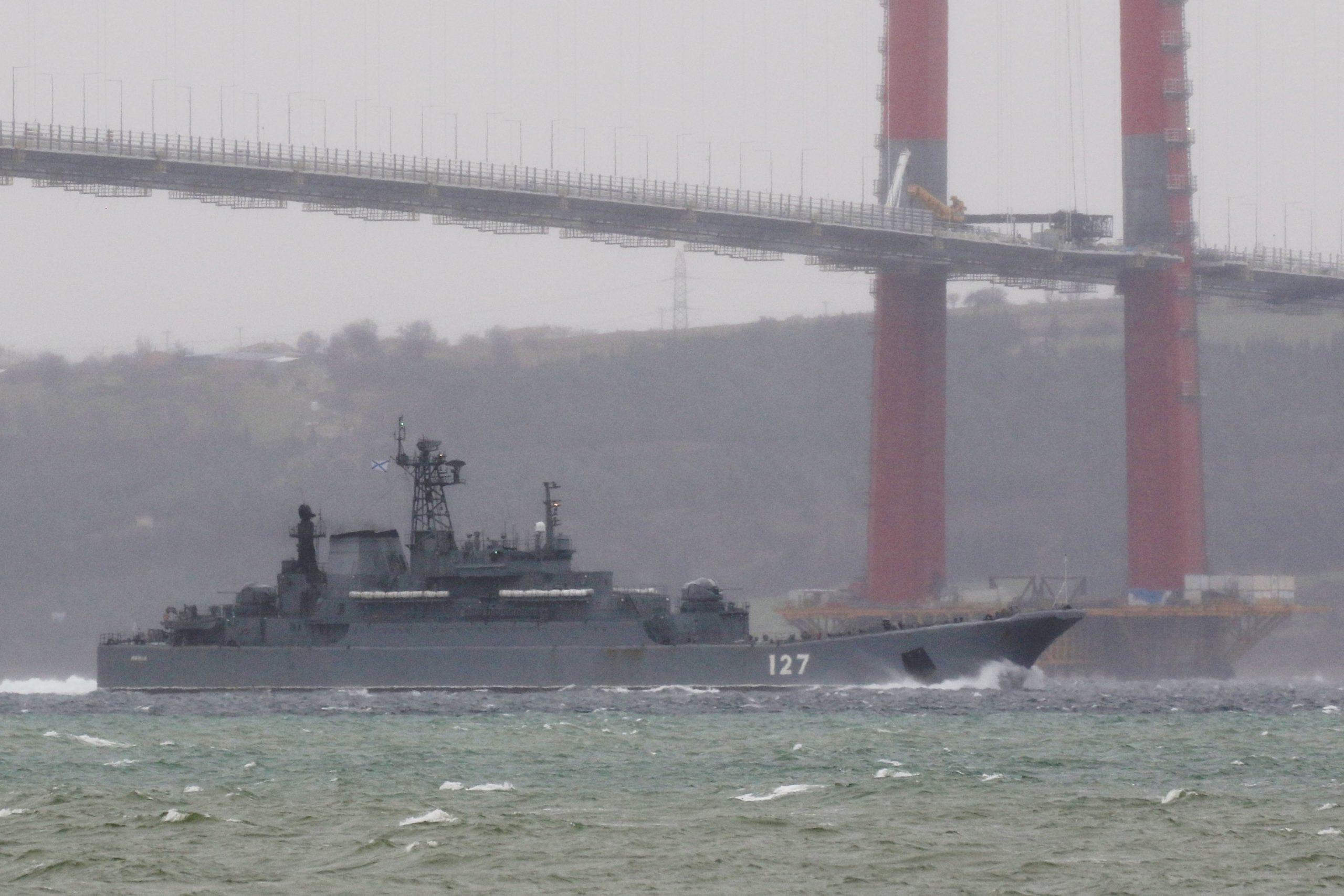 Anúncio é feito 1 dia após a Ucrânia dizer que Exército realizará 10 dias de exercícios militares, com drones e mísseis antitanque, em resposta às atividades das tropas russas na vizinha Belarus. Navio de guerra Minsk, da Marinha da Rússia zarpa de Canakkale, na Turquia, em 8 de fevereiro de 2022, a caminho do Mar Negro