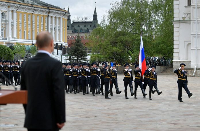 Moscou tem provocado inquietação entre potências ocidentais devido a movimentação de tropas que leva a crer que uma invasão da Ucrânia pode estar próxima. Vladimir Putin observa marcha de comemoração à vitória soviética na Segunda Guerra, em 9 de maio de 2020