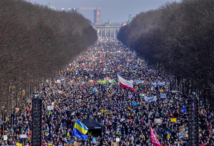 27 de fevereiro – Manifestantes protestam contra a invasão da Ucrânia, em Berlim, na Alemanha