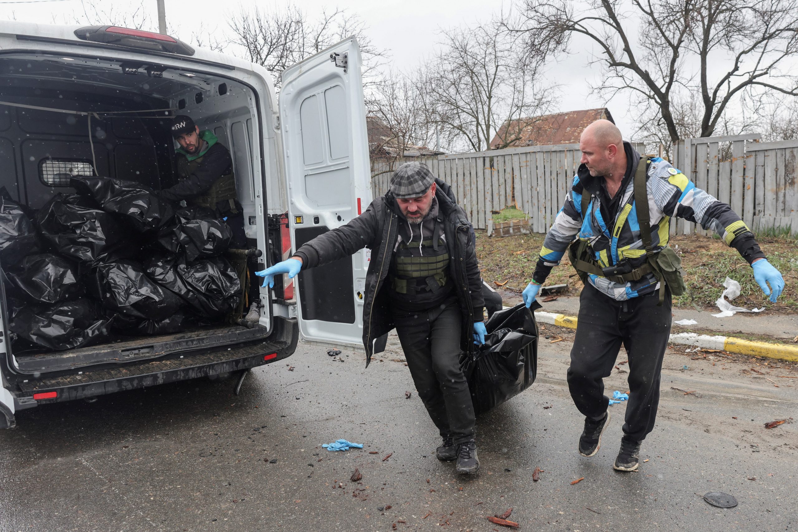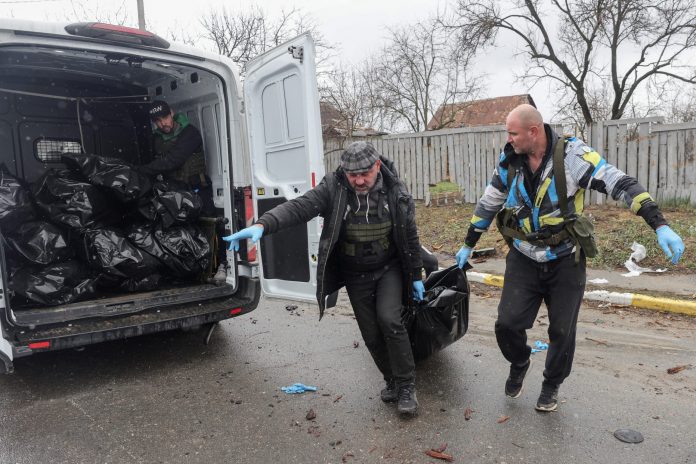 Guerra na Ucrânia – voluntários recolhem corpos de civis mortos por soldados russos em Bucha, segundo moradores.