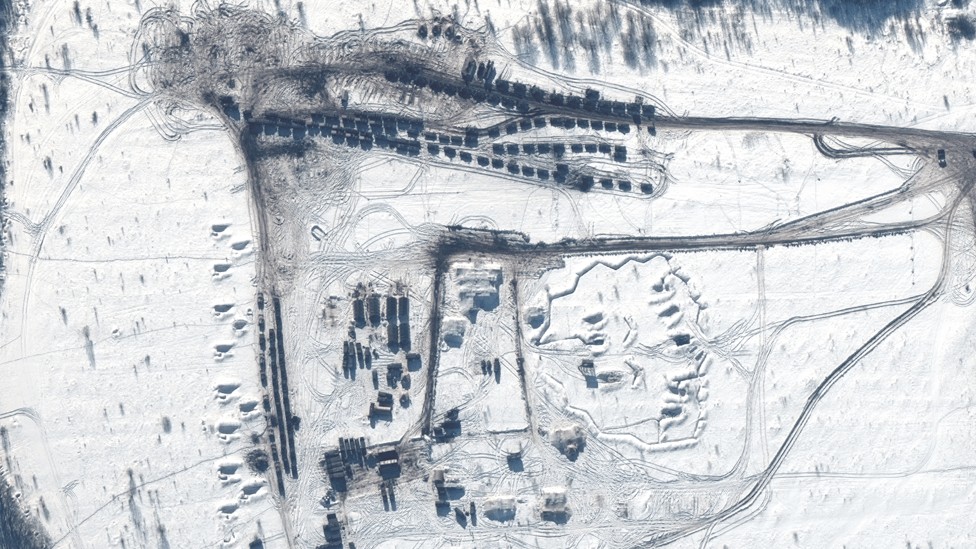 Imagens feitas em meados de fevereiro mostram que Ucrânia continua cercada por tropas nas fronteiras com Rússia e Belarus. Imagens de satélite mostram tropas russas perto da fronteira com a Ucrânia