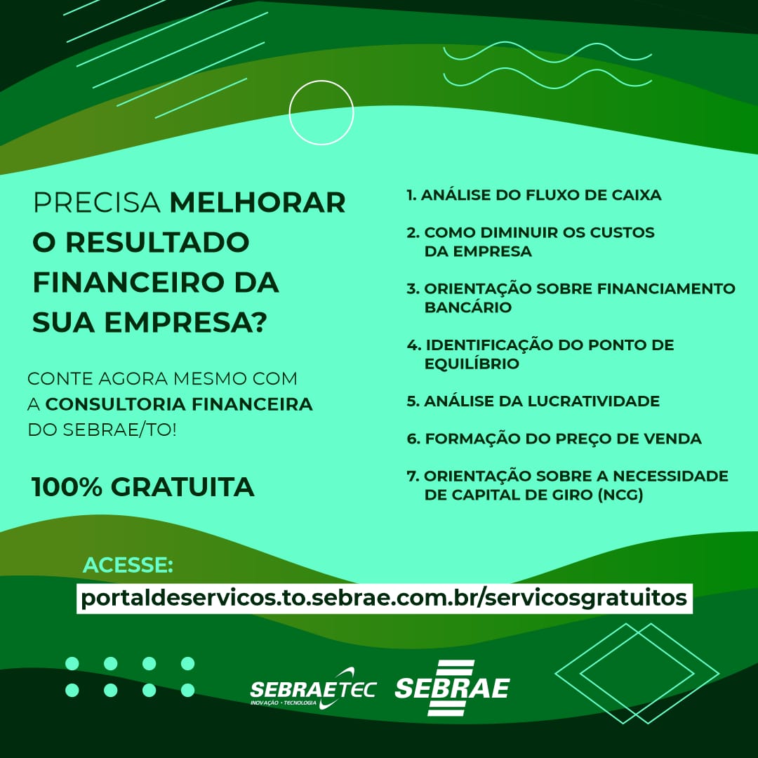 Em apoio aos pequenos negócios neste período de pandemia do Coronavírus, o Sebrae Tocantins disponibilizou consultorias gratuitas em finanças e comunicação visual. Para se inscrever, o empresário interessado deve preencher um cadastro, disponível em http://portaldeservicos.to.sebrae.com.br/servicosgratuitos/. Todo esse atendimento será gratuito e o empresário não precisa arcar com nenhum custo.