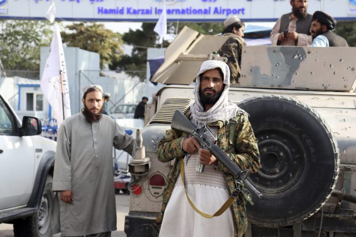 Combatentes do Talibã montam guarda em frente ao Aeroporto Internacional Hamid Karzai, em Cabul, após a retirada dos Estados Unidos da capital do Afeganistão, em 31 de agosto de 2021