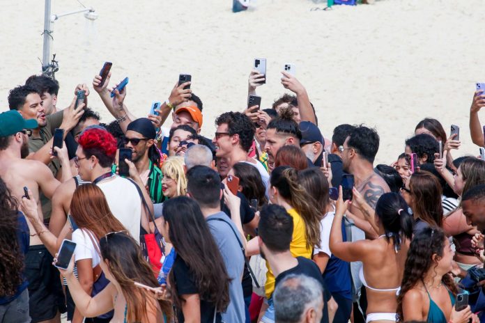 Shawn Mendes é cercado por multidão de fãs na praia de Ipanema