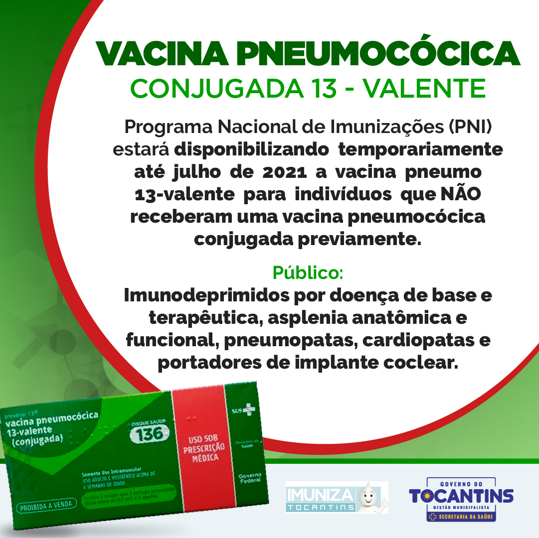 A Secretaria de Estado da Saúde (SES) informa que o Programa Nacional de Imunizações (PNI), do Ministério da Saúde (MS), está disponibilizando, temporariamente, até julho de 2021 a vacina Pneumocócica Conjugada 13-valente, para pacientes com doenças cardiovasculares e outros grupos prioritários como imunodeprimidos, com asplenia anatômica e funcional, portadores de implante coclear, pacientes com doenças pulmonares que ainda não tenham recebido uma vacina pneumocócica anteriormente.