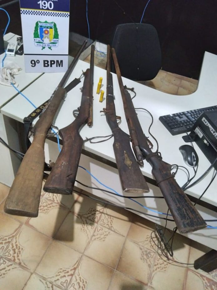 Quatro espingardas de fabricação caseira foram apreendidas na casa de um homem, de 57 anos, suspeito de homicídio, no município de Itaguatins, norte do estado. Segundo a Polícia Militar, o investigado conseguiu fugir pulando o muro ao perceber a presença dos militares.
