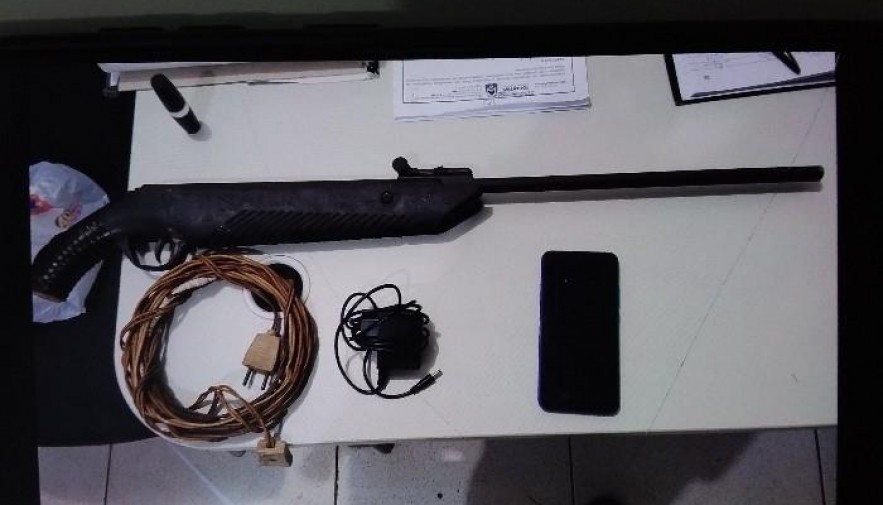 Durante acompanhamento, o passageiro da motocicleta soltou uma espingarda. Questionado, ele disse que a arma era do condutor da moto. Durante revista os policiais localizaram um celular com registro de furto e um carregador de tornozeleira eletrônica.