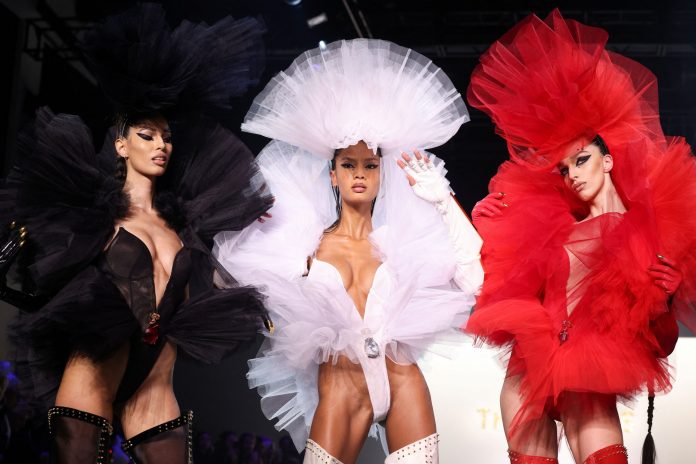 A dupla de estilistas The Blonds encerrou a Semana de Moda de Nova York na quarta-feira (16) com um desfile cintilante com roupas costuradas à mão cobertas de cristais, saltos brilhantes e joias.