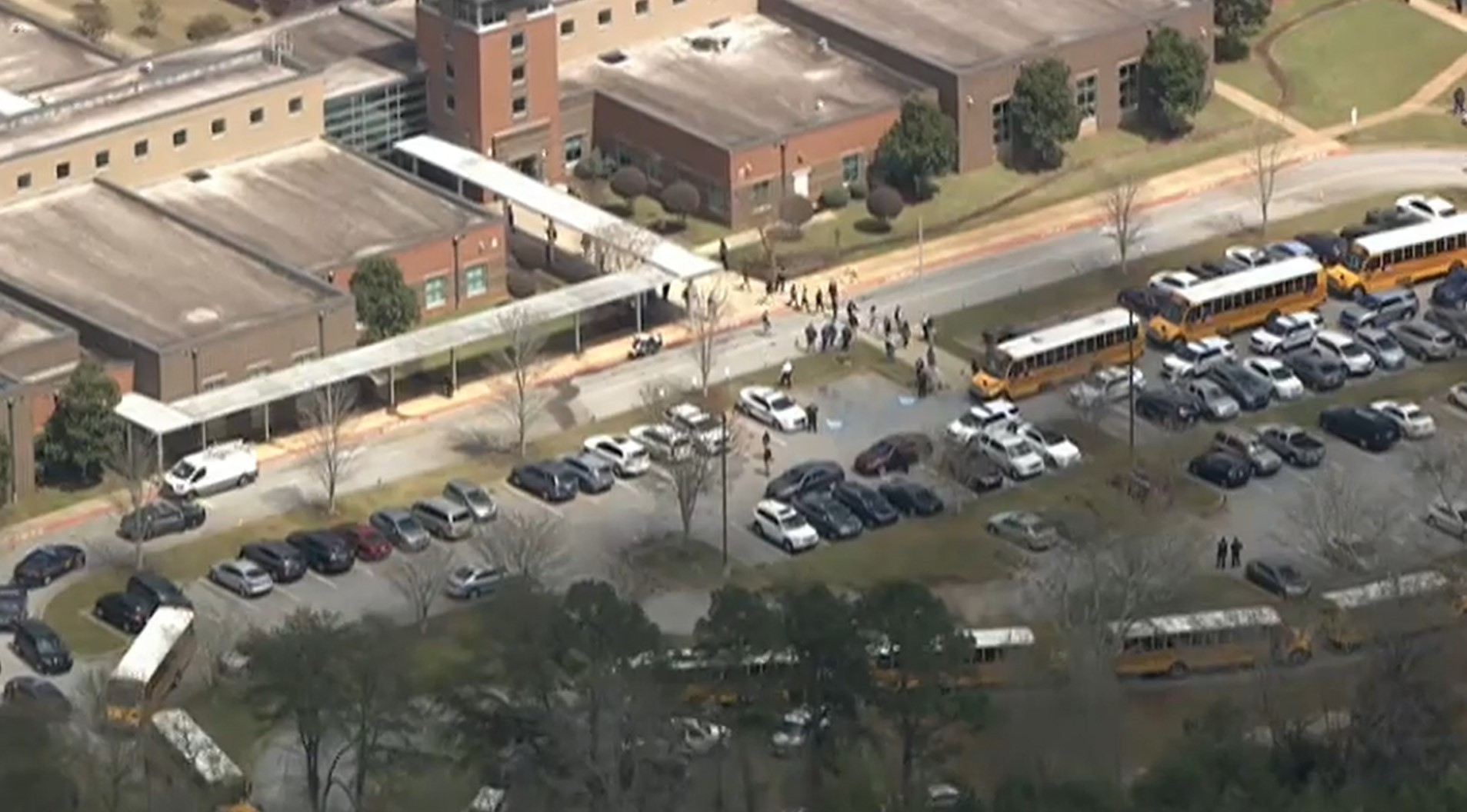 Imagens transmitidas ao vivo pela televisão americana mostram uma fila de ônibus escolares esperando a retirada dos estudantes.