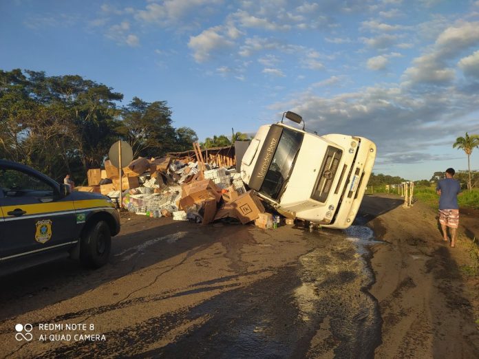 Um caminhão que trafegava pela via tombou no km 25 e a carga se espalhou pela pista. A PRF disse que a ocorrência está em andamento. Não há informações sobre mortos ou feridos.