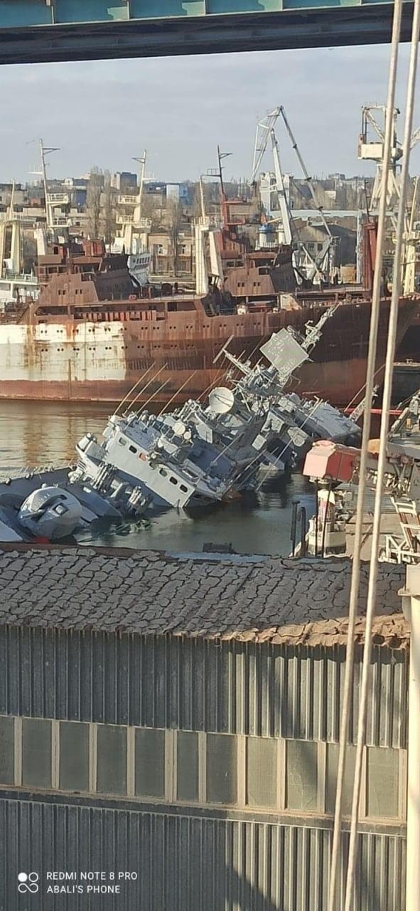 Fragata Hetman Sahaidachny foi parcialmente desmontada e passava por reparos. Segundo site local, seu casco foi inundado para que, no futuro, a embarcação possa ser reerguida. Fragata Hetman Sahaidachny foi afundada para impedir que caísse nas mãos dos russos