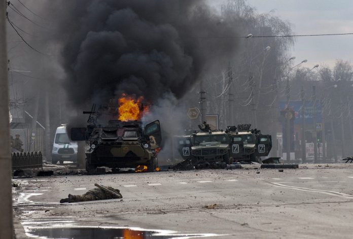 ‘Foi decidido entregar os soldados russos capturados às suas mães, se elas vierem buscá-los na Ucrânia, em Kiev’, afirmou ministério ucraniano. Um transportador de pessoal blindado russo queima em meio a veículos utilitários leves danificados e abandonados depois de lutar em Kharkiv, Ucrânia.