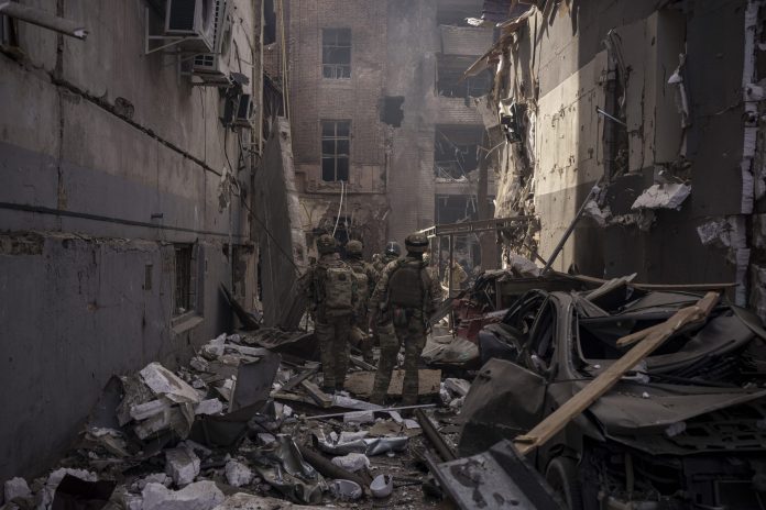 A vila de Ruska Lozova fica em uma estrada entre Kharkiv, na Ucrânia, e Belgorod, na Rússia. Soldados ucranianos andam em meio a escombros após ataque russo a Kharkiv, na Ucrânia, neste sábado (16).