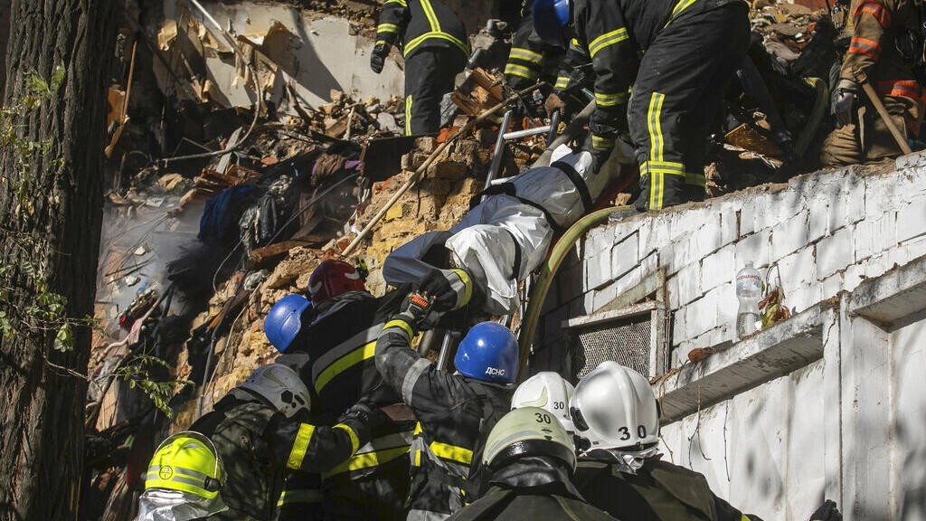 De acordo com Volodymyr Zelensky, presidente da Ucrânia, desde 10 de outubro, 30% das centrais elétricas do país foram destruídas por conta do conflito com a Rússia. Os bombeiros carregam o corpo de uma pessoa morta depois que um drone atingiu um prédio em Kiev, Ucrânia, na segunda-feira, 17 de outubro de 2022
