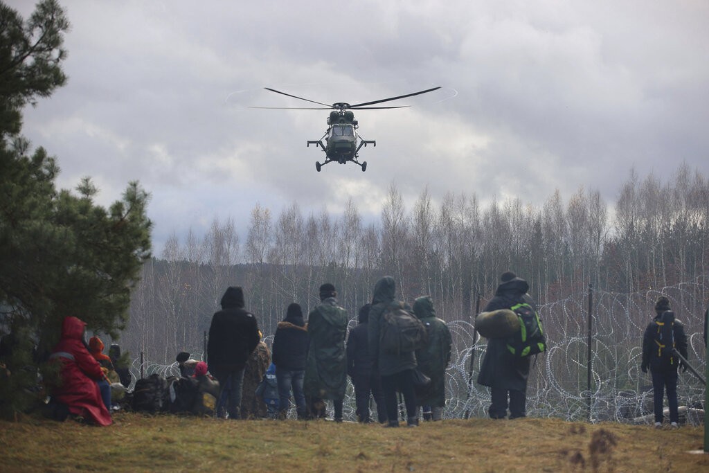 Helicóptero militar da Polônia vigia grupo de migrantes que tenta entrar no país por meio da fronteira com Belarus nesta segunda (8)