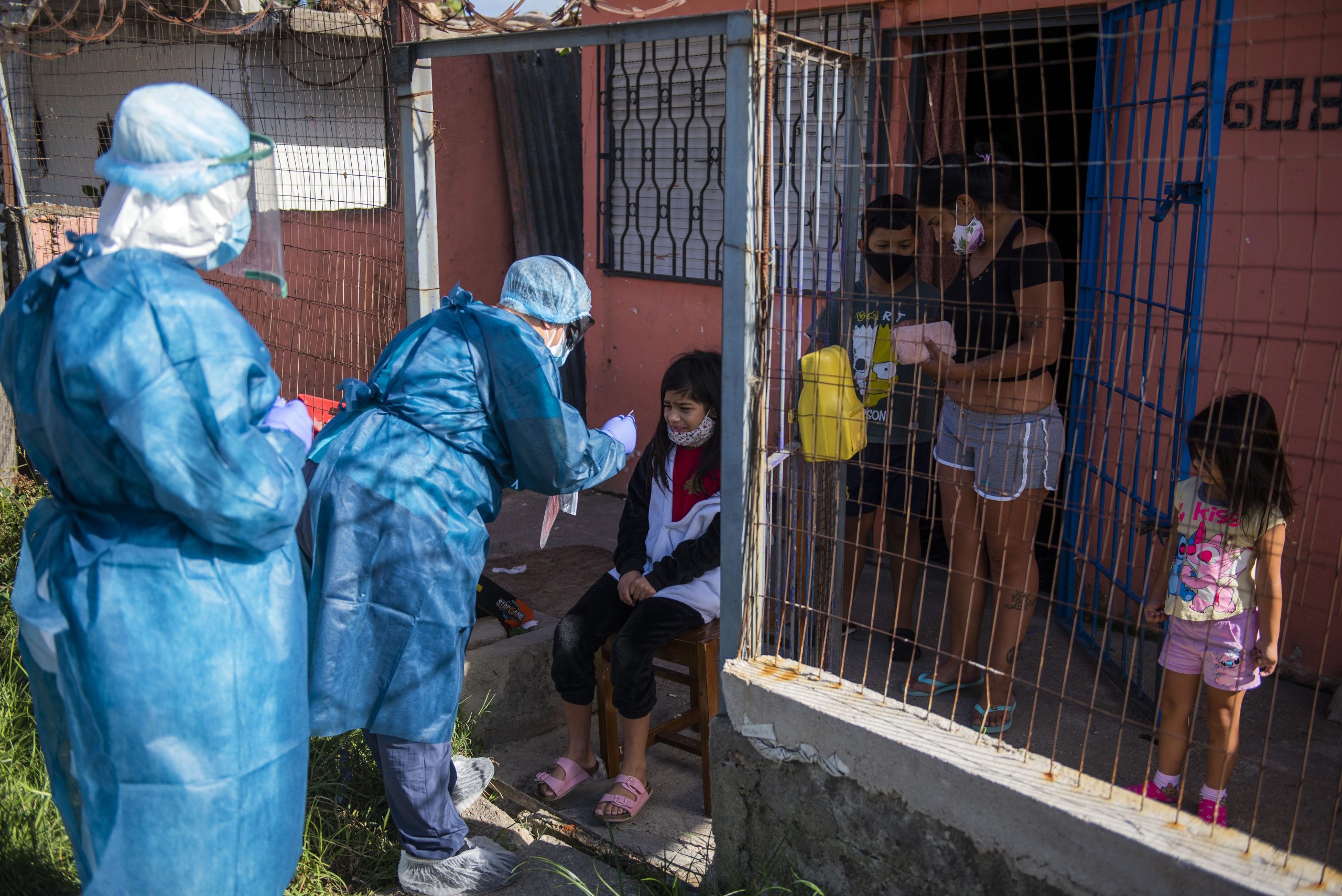 Estado de emergência de saúde em razão da Covid-19 foi decretado em março de 2020. Profissionais de saúde coletam amostra para teste de Covid-19 em crianças na periferia de Montevidéu, no Uruguai, em 18 de março de 2021