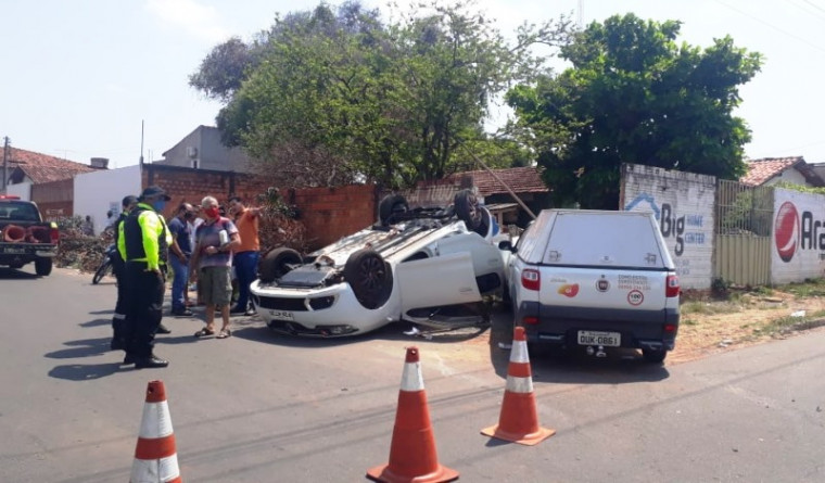 Um veículo Renault Sandero capotou e parou de rodas para cima após uma colisão registrada no cruzamento das ruas Falcão Coelho com a Humberto de Campos, no Bairro São João, em Araguaína, na manhã desta quinta-feira (15).