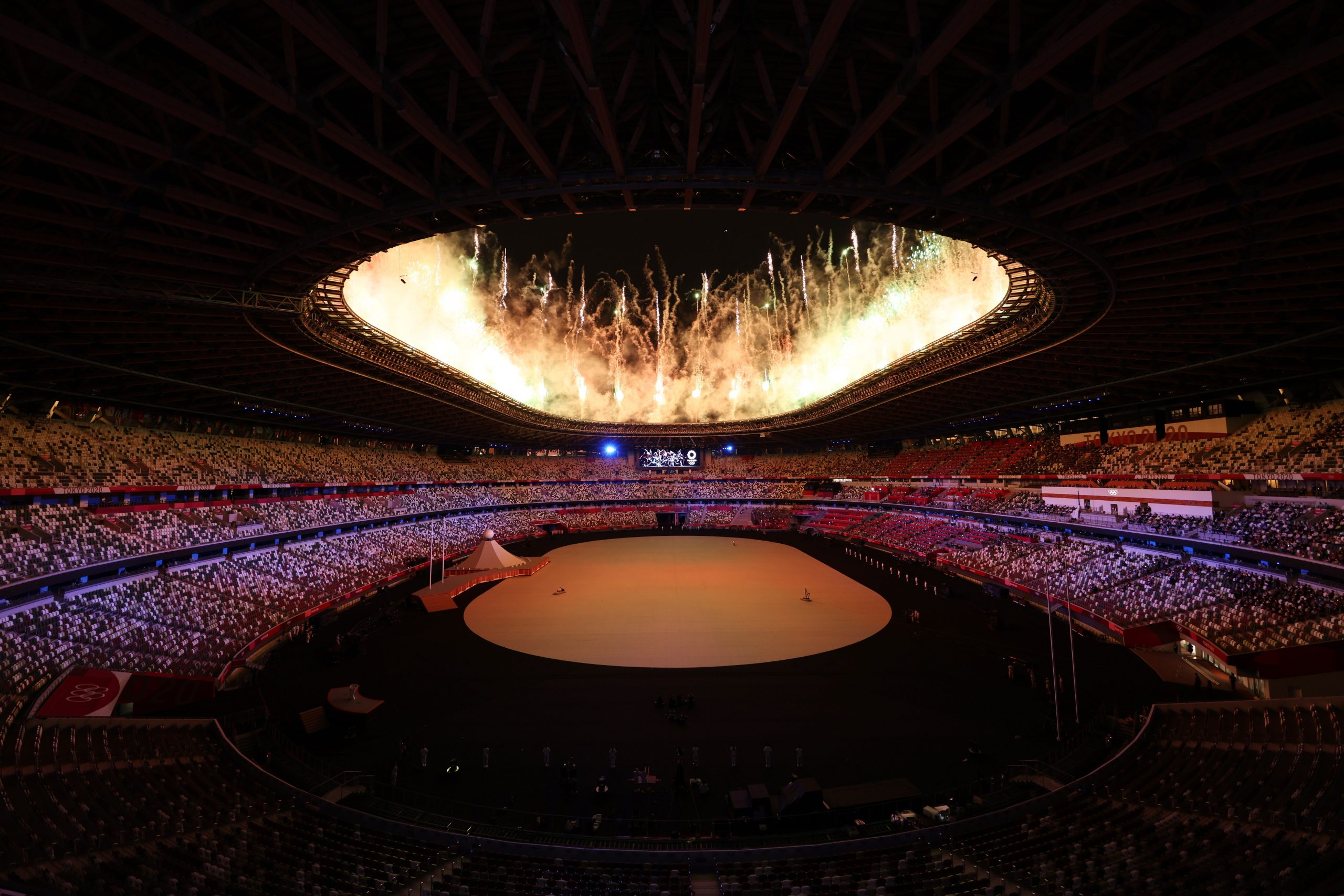 Imagem do estádio Olímpico de Tóquio com as cadeiras vazias durante a cerimônia de abertura