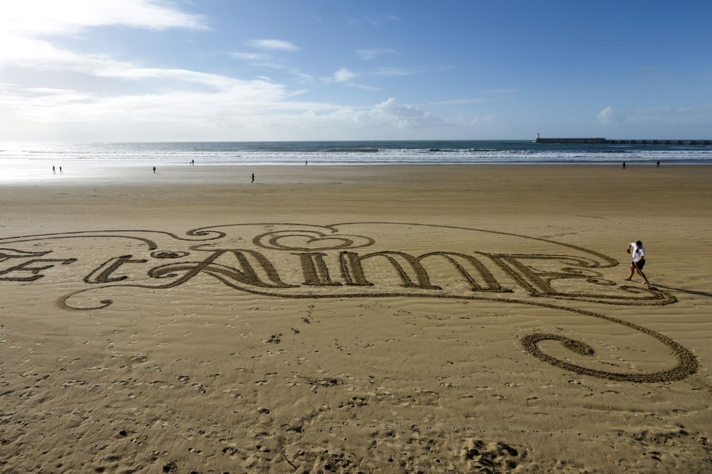 A data é uma referência a um padre romano que defendeu o casamento no século 3. A maioria dos países celebra o dia dos namorados nesse dia. ‘Eu te amo’ escrito em Francês na areia de Les Sables d’Olonne, na costa oeste do país, em 14 de fevereiro de 2022