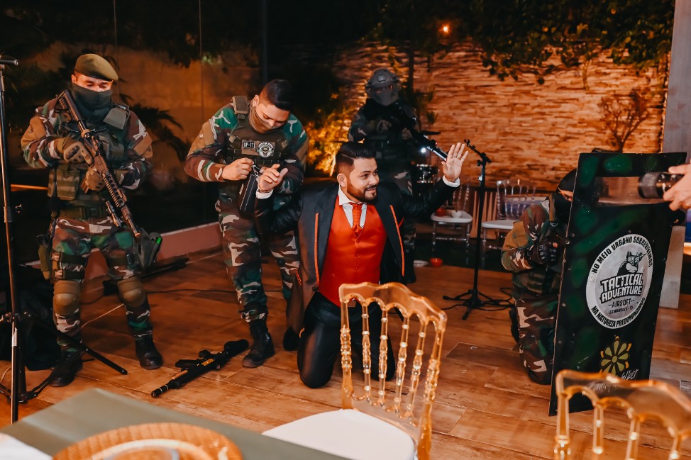 Amigos de noivo apareceram fardados e com armas de airsoft para fazer brincadeira