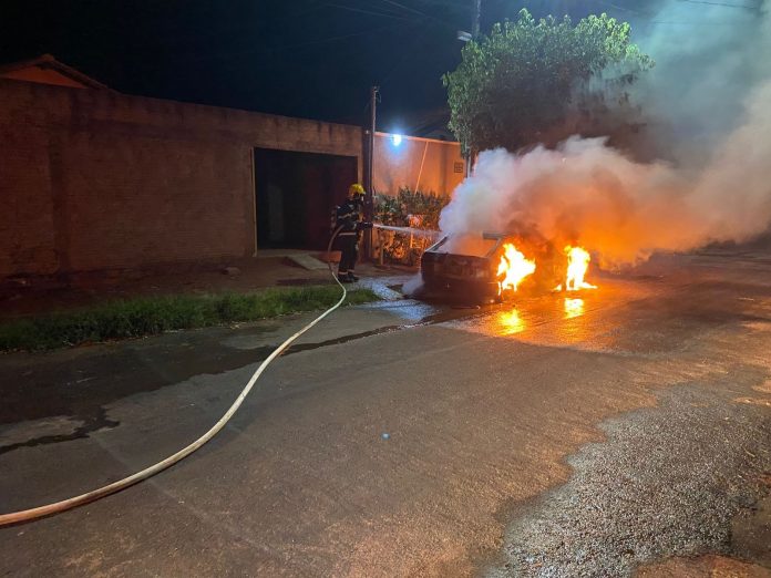 Bombeiros combatem chamas após homem atear fogo em carro na cidade de Gurupi