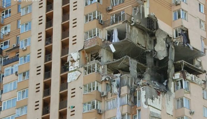 É possível ver o míssil entrando em um apartamento, provocando um clarão e destruindo completamente o imóvel. Prédio residencial é atingido por míssil em Kiev