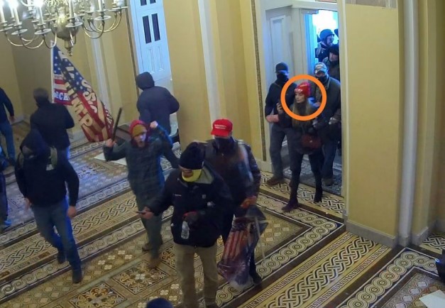 Alguns segundos mais tarde, é possível ver Jacob Chansley, que ficou conhecido por invadir o Capitólio com um chapéu de chifres. Ele também já foi preso e condenado a 3 anos e 5 meses de prisão.