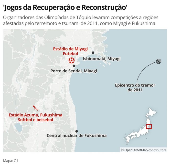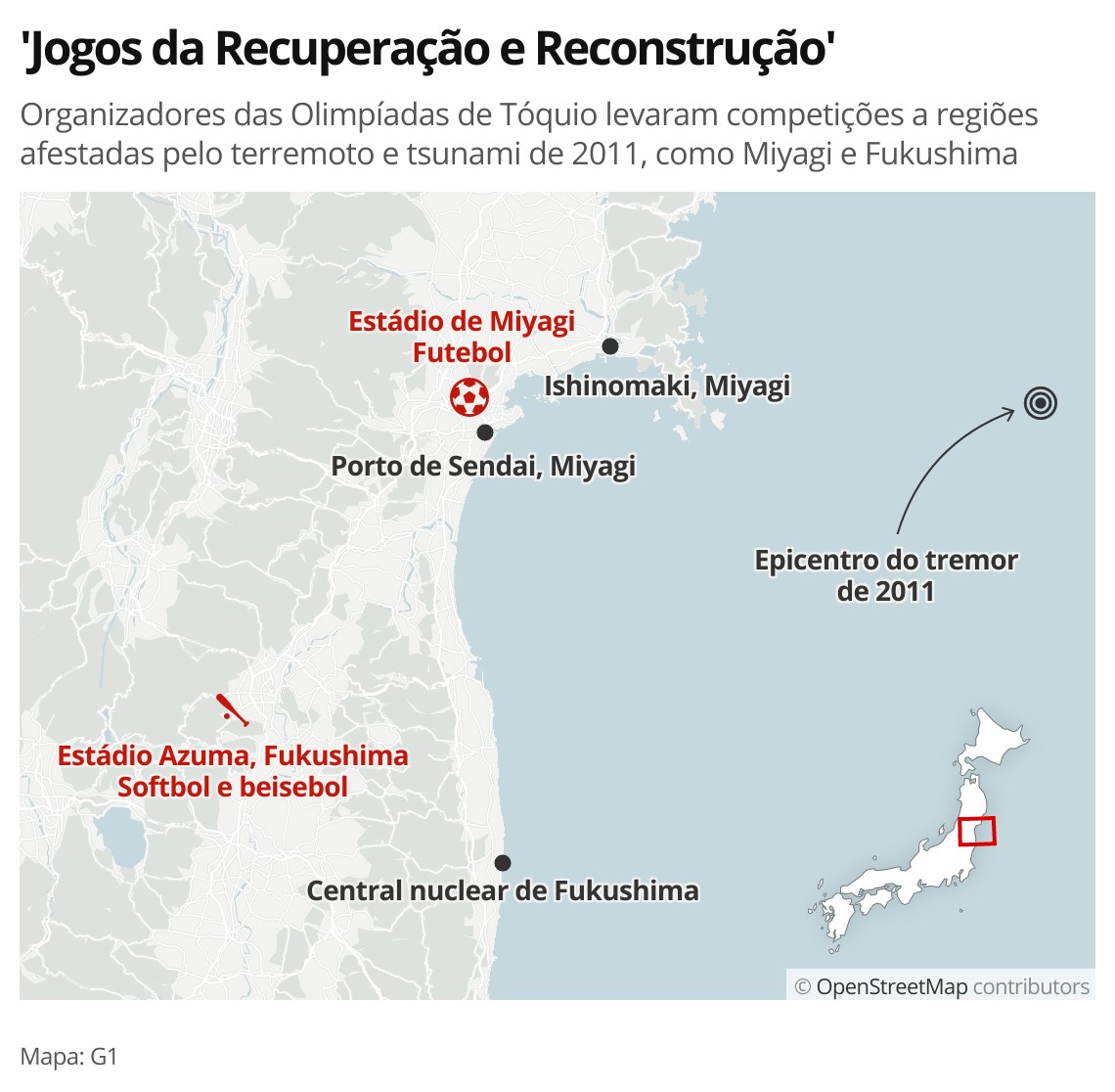 Terremoto com magnitude 9,1 em março de 2011 causou um tsunami que devastou o nordeste do Japão. Com o mote ‘Jogos da Recuperação e da Reconstrução’, organizadores levaram alguns jogos de futebol, beisebol e softbol a essas localidades. VÍDEO: Fukushima e Miyagi vão sediar Olimpíadas do Japão 10 anos depois de tsunami