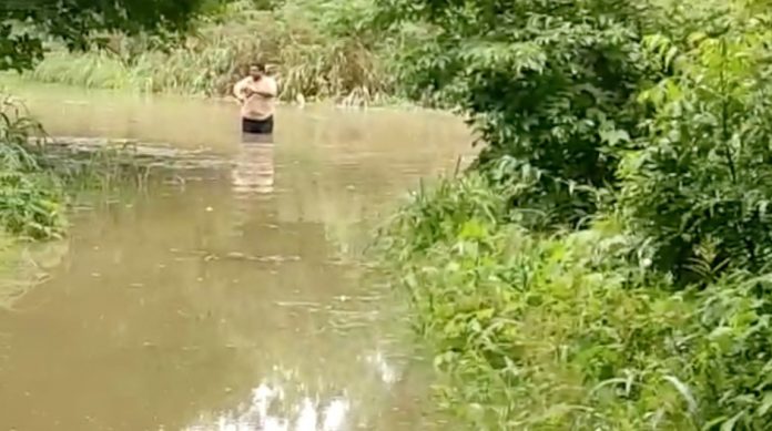 Homem caminha por estrada inundada pela água na zona rural de Peixe