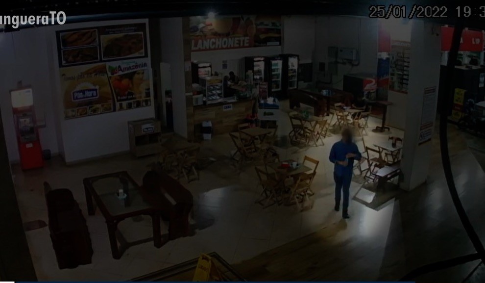 O vídeo foi feito às 19h32 em uma lanchonete do posto. O suspeito aparece com uma camisa azul de mangas longas, calça e tênis em tons mais escuros e um boné preto. Ele caminha com o que parece ser uma garrafa de água nas mãos.